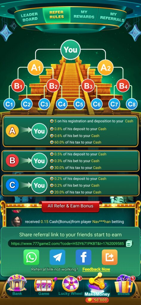 Guys, after binding apk 777 game .you are so lucky than you use my link to download all Rummy game. After binding your go to refer and click the app link copy. You shere verious social media platforms as for teligram, WhatsApp, instagram, threads, twitter etc get bonus.